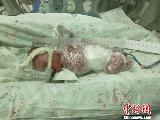 甘肃省妇幼保健院18日发布消息称,该院近日成功救治一名胎龄仅23周加5天的超早产儿。图为小壮壮刚出生时,体重只有550克。 田健 摄
