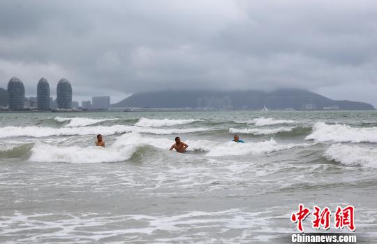 18日中午记者在三亚湾看到,三五成群的市民游客不惧台风带来的风雨浪潮,嬉水玩乐。