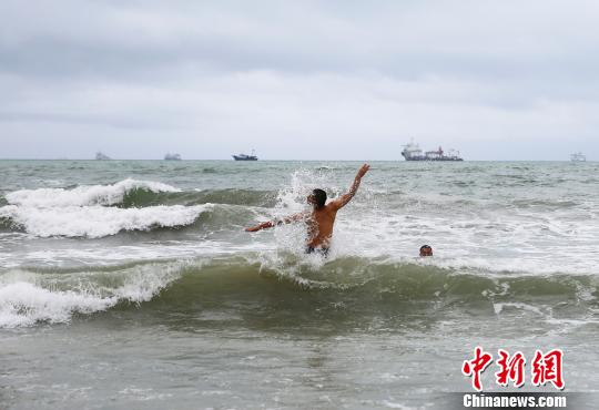 中新网三亚7月18日电(记者 王晓斌)今年第9号台风“山神”7月18日凌晨登陆海南后,一路向西“横穿”海南岛进入北部湾南部海域。受“山神”影响,三亚风雨天气持续。蜈支洲岛、大小洞天、天涯海角等涉海、涉山旅游景区自7月18日早上起暂停营业。恶劣天气未能阻挡游客出游脚步,在三亚湾,市民游客不惧台风带来的风雨浪潮,嬉水玩乐。