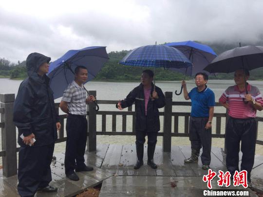 工作人员在巡查三亚水库防台状况。 王卫 摄