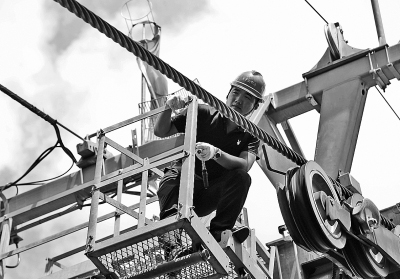18日,湖南省张家界武陵源风景区天子山索道检修工人冒着酷热爬上索道支架,对缆绳、轮组、螺栓等设备进行安全检查。7月以来,张家界风景区迎来旅游旺季,当地旅游部门和景区各企业加大日常检查维护力度,全力保障游客游览安全。吴勇兵摄/光明图片