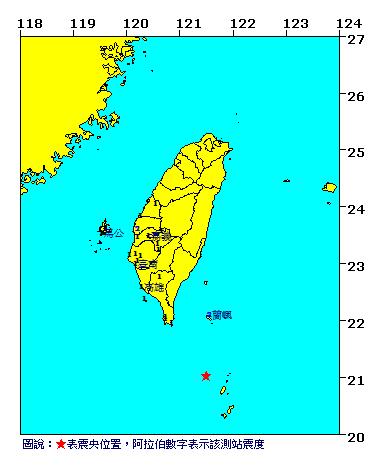 中新网7月20日电 据台湾气象部门官方网站消息,7月20日9时39分,台湾台东县南部海域发生里氏5.6级地震,震源深度108.9公里,震中位于台东县府南方206.5公里海域,最大震度台东、云林为2级,屏东、高雄、台南、嘉义、彰化、澎湖均为1级。