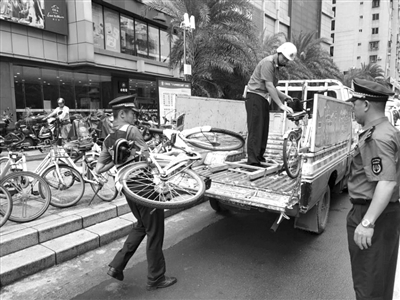 吴福兴说,共享单车成了城管队员日常巡查的一项重要工作,每当看到路面上有乱停乱放的共享单车,队员们就会马上联系共享单车运营企业管理人员到现场将车辆挪走或摆放整齐。“刚开始他们还很积极,后来就叫不动了。”吴福兴说,在这种情况下,城管队员只能将车辆摆放好,如果有很多辆共享单车乱停放,则只能出动板车,查扣车辆。
