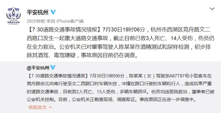 中新网7月30日电 据杭州市公安局官方微博消息,7月30日19时06分,杭州市西湖区竞舟路文二西路口发生一起重大道路交通事故,截止目前已致3人死亡、14人受伤。