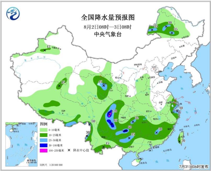 8月2日08时至3日08时,四川盆地中西部、江南大部、华南北部、云南大部、内蒙古东北部、西北地区中部偏东地区等地有中到大雨,其中,四川盆地西部、贵州中部局地有暴雨或大暴雨(100~120毫米);上述部分地区伴随短时强降水,局地并伴有雷暴大风等强对流天气。江淮东部、江南东部等地的部分地区有5~6级风,阵风可达7级以上;东海北部海域将有6~8级、阵风9级的旋转风,其中台风中心经过的附近海域风力可达9级、阵风10~11级(见图4)。