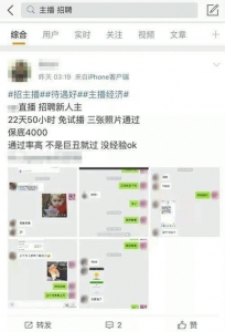 各大直播平台上土豪也非常多,动不动就几万几十万地打赏。这些给了爱美且渴望鲜花和掌声的女孩子一夜爆红的不切实际的幻想。打开任意一个社交软件,搜索“主播招聘”会立刻弹出上万条信息,其中不乏“月入上万不是梦”“管吃管住,不是巨丑就过”这样极具吸引力的条件。