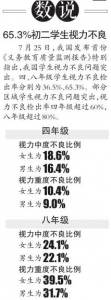 《义务教育质量监测报告》指出,学生视力不良问题突出,四年级、八年级学生视力不良检出率分别为36.5%和65.3%。实际上,不仅仅只有报告中义务教育的学生存在视力问题,我国青少年视力的整体情况也十分不乐观。根据世界卫生组织的最新研究报告,目前中国近视患者人数多达6亿。其中我国初高中生和大学生的近视率均已超过七成。我国青少年近视率已高居世界第一。相比之下,美国青少年的近视率约为25%,澳大利亚仅为1.3%,德国的近视率一直控制在15%以下。