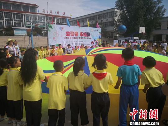 8月8日,甘肃省红十字会联合兰州本土知名乐队——低苦艾乐队走进白银市白银区金山中心小学,为100名乡村孩子送去100个“益乐阅读包”,为他们点亮阅读梦想。图为现场趣味游戏。 崔琳 摄