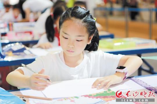 曾巳恩、艾熙茹都是来自湖南师范大学附属小学的学生。8月10日一大早,她们赶到广州国际会展中心参加小学低年级组比赛,被安排在前面第一、二排的位子。随着清脆的比赛铃声响起,两位选手迅速把比赛需要的工具一一有序排开,一笔一画开始手绘作品,没多久手抄报的概貌便跃然纸上。来自长沙市岳麓区第一小学的刘家昱参加的是8月11日上午的小学高年级组比赛。