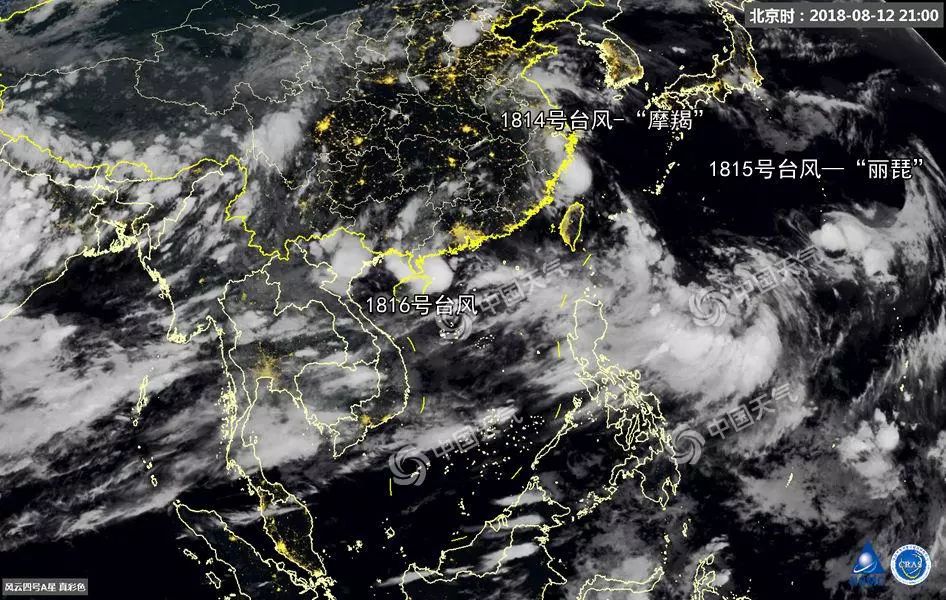 △目前,西北太平洋上“三台共舞”,分别是1814号台风“摩羯”,1815号台风“丽琵”和1816号台风。