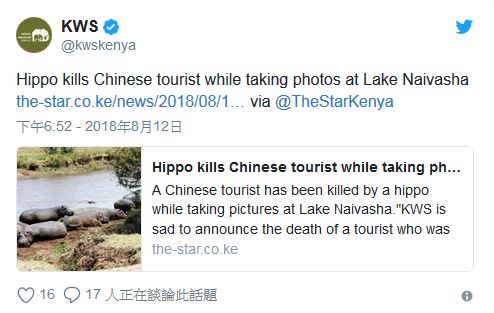 东非肯尼亚野生生物服务署(KWS)12日在Twitter上公布,两名中国游客在当地遭河马袭击。