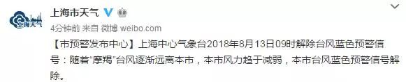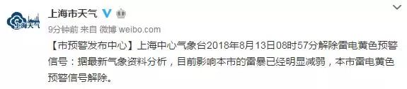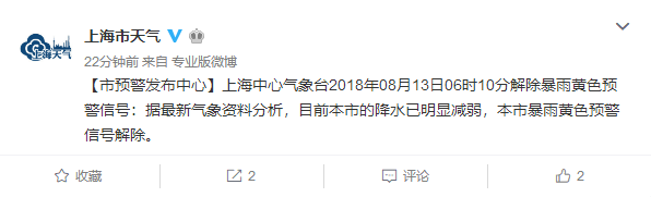 上海中心气象台8月13日6时10分解除暴雨黄色预警信号