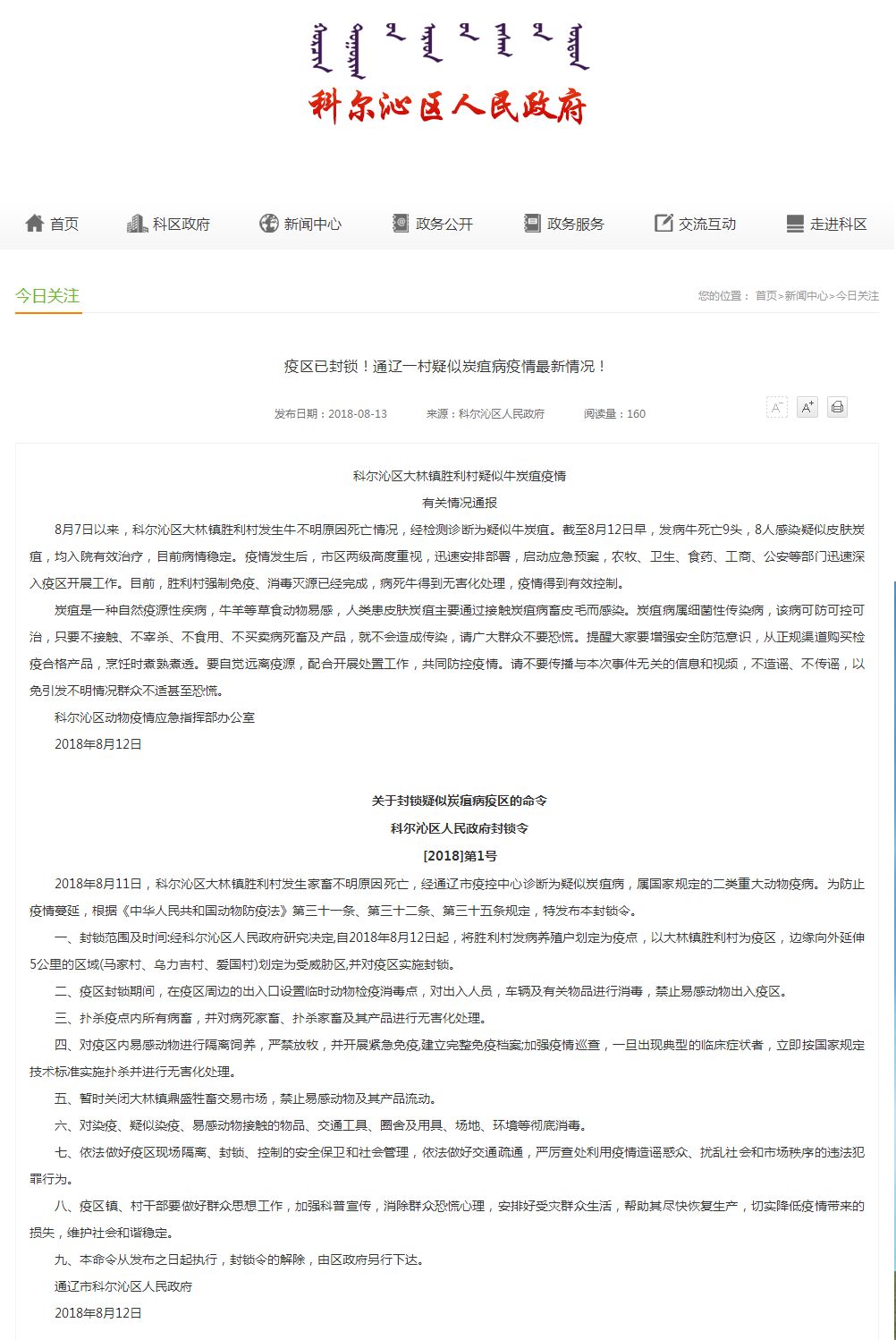 官方消息称,8月7日以来,科尔沁区大林镇胜利村发生牛不明原因死亡情况,经检测诊断为疑似牛炭疽。截至8月12日早,发病牛死亡9头,8人感染疑似皮肤炭疽,均入院有效治疗,目前病情稳定。
