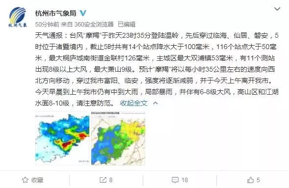 而来自市防指消息,6:30时,杭州平原区普遍出现8级风,最大风力富阳龙门岭10级风。