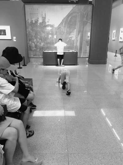 “小朋友,不要摸了。”“小朋友,不要乱跑。”“展厅里不能吃东西!”中国美术馆的展厅里,往来巡视的工作人员需要把精力重点放在制止展厅各处不遵守规则的熊孩子上。8月7日,尽管这天不是周末,由家长领着来看展的小朋友可不少。记者发现,有不少孩子在馆中玩闹,还有的趁工作人员不注意时触摸展品。