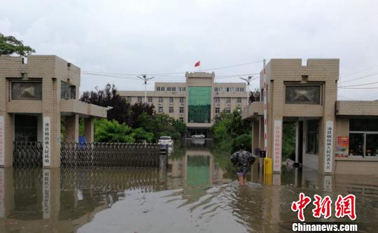 19日,记者在沛县栖山镇看到,多条街道都灌满水,镇政府院内积水最高也达到50厘米以上。栖山镇卫生院内积水达到人的腰部,多个科室的电脑来不及搬出,被雨水浸泡。积水还导致停电,卫生院工作几乎停滞。该镇汽车站门由于修路,导致积水下路况不明。镇政府安排的几位身穿迷彩服工作人员站膝盖深的水中,指挥过往车辆行人通过危险处。