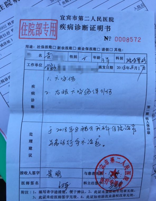 天台村大院组组长田天彬被喻家荣从坡上叫回来,赶紧骑摩托车将婆孙俩送往思坡镇卫生院。因伤情严重,镇卫生院给孩子处理伤口后,叫谢红珍马上送孩子到宜宾市三医院抢救。几经周折,小玉书最后被送进了宜宾二医院,当日下午进行了伤口缝合。