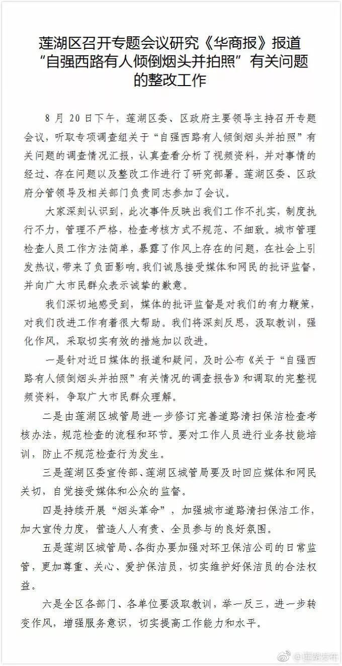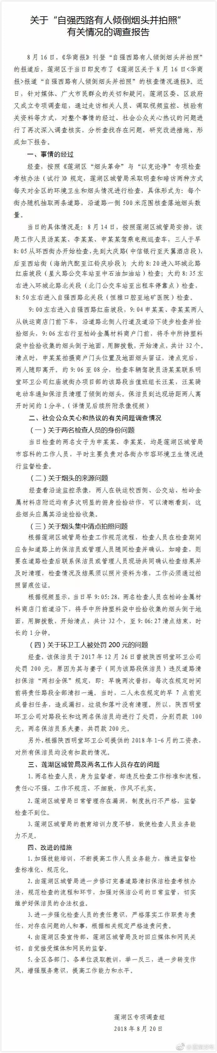 随后,莲湖发布还公布了一段监控视频,为8月14日,莲湖区城管局工作人员驾驶电瓶巡查车履行烟头捡拾情况,视频从早8点05分三人开始检查,一直到上午9点05左右,两名检查人员将烟头扔到地上清点数量。