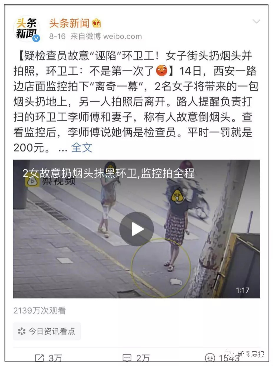 8月16日,相关视频爆出,诸多媒体报道,“扔烟头拍照,检查员‘诬陷’环卫工”成为热点事件,备受关注。@今日头条 发布的相关博文,热度最高,转发3万+、评论2万+。