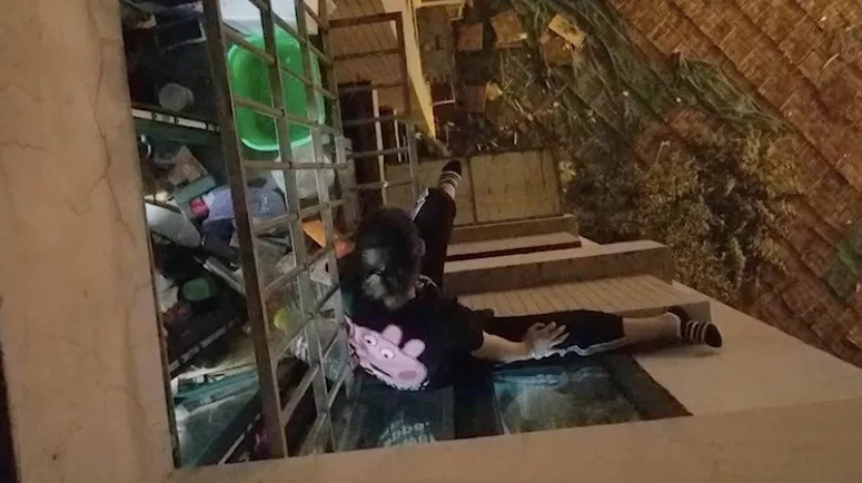 当时,孕妇小李已经从11楼的窗户爬到10楼外的窗台保笼上,两条腿搁在狭窄的墙沿和保笼铁架上,没有着力点,非常危险。