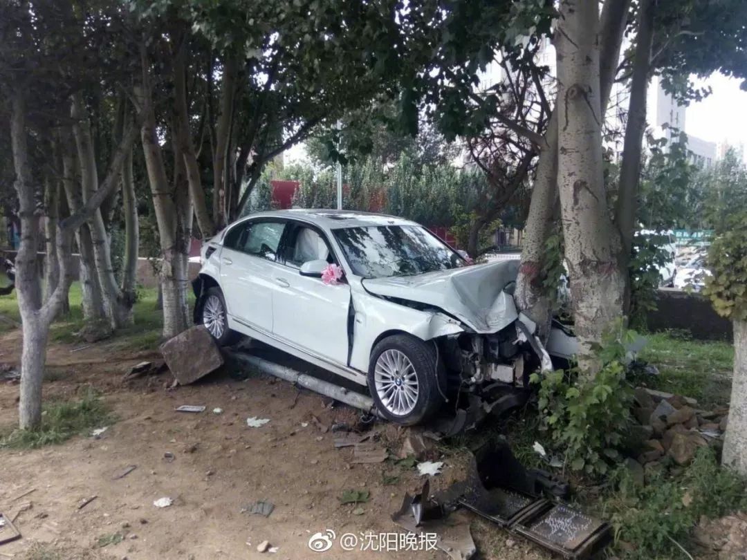 被撞的宝马5系最为严重,整个车身已经完全卡在了两棵树之间,后风挡玻璃掉在了草丛里,车头车尾受损严重,巨大的撞击导致发动机仓完全凹陷;