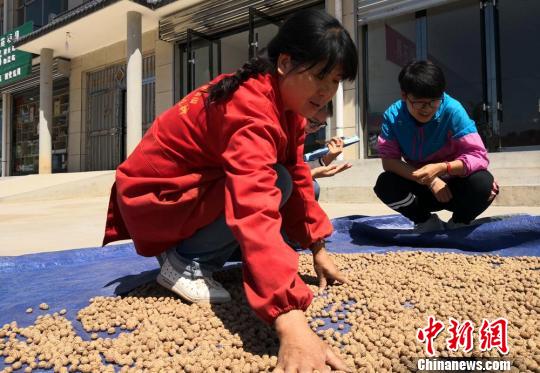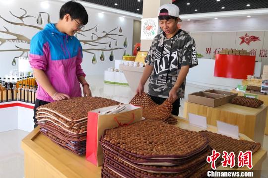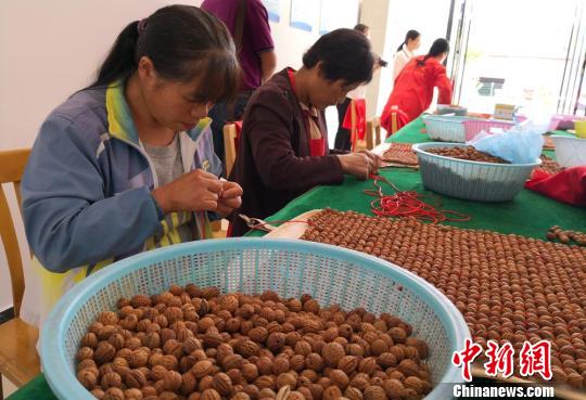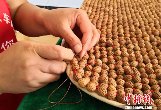 中新网兰州8月29日电 (记者 刘玉桃)经过筛捡、打磨、清洗、晾晒、钻孔、编织等十多道工序,一件手工制作的山毛桃坐垫完成了。负责编织工序的甘肃省平凉市静宁县界石铺镇关湾村村民张瑜,一天可完成一件产品。“一件可以挣70元钱,一个月下来有2000多元收入,在家门口打工很方便。”