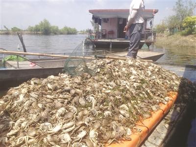 29日上午,记者踏上开往胜利村的小渔船,空气中依然能闻到死鱼死蟹的腥臭味。开船的渔民说:“这几天已经捞上来不少死鱼死蟹,不然整个湖水都会恶臭,水质更加恶化。”沿着河道前行,两岸不时可见堆放着成堆的死蟹死鱼。