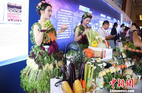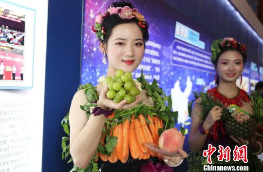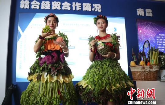 8月31日,第16届赣台经贸文化合作交流大会在江西南昌开幕。在此间的江西台资企业产品展览上,两位靓丽模特身穿“果蔬装”亮相现场推介农产品,吸引了众多参会嘉宾的注意。 刘占昆 摄