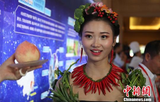 两位靓丽模特身穿“果蔬装”亮相现场推介农产品,裙子、头饰均为果蔬精心制作。 刘占昆 摄