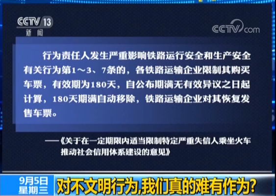 你不是站不起来嘛,那好,您甭坐这火车了,多长时间内?180天,那么各铁路运输企业,要限制其购买车票,因为他已经严重影响到了铁路运行安全和生产安全,有效期180天,从公布期满无有效异议之日起来计算,180天期满之后自动移除,铁路运输企业对他恢复发售车票,180天的时间,你说长也不长,你说短对一个公民来说也不是太短,这半年的时间,我们怎么看?接下来我们连线一位嘉宾,来自上海大学社会学院的顾骏教授,顾骏教授您怎么看这个半年的时间对这个人的一孙某的一种惩罚吧叫做?