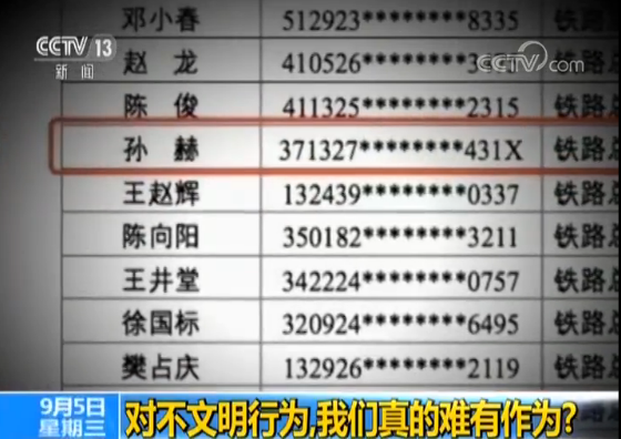 董倩:这段视频什么时候看什么时候来气,这件事是发生在8月21日,那么几天之后在8月24日的时候济南铁路公安处就依据我们国家的《治安管理处罚法》的规定,罚了这个孙某两百块钱,这事还没完,在前天9月3日国家公共信用信息中心发布了8月份新增的失信联合惩戒对象公示,其中就有铁路公司提供的200多个失信人的名单,当然这个孙某一定是在名单之上,那么在名单上的后果是什么我们来看一下——限制乘坐所有火车的席别。