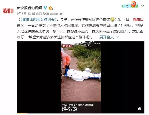 9月5日,@新京报我们视频发布了对该女子的搜救视频。其中提到“女孩在遗书中称自己得了抑郁症。‘很多人把这种病当成脆弱,想不开。我想说不是的,我从来不是个脆弱的人’”。女孩还呼吁,“‘希望大家能多多关注抑郁症这个群体吧’”。