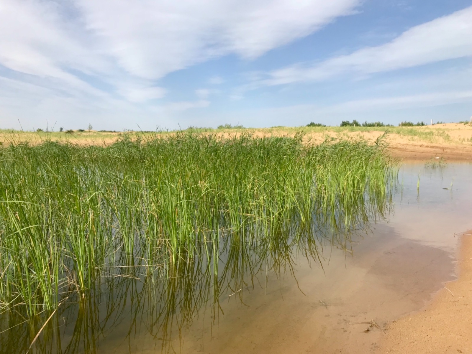 走进位于杭锦旗呼和木独镇巴音温都尔嘎查的库布其沙漠水生态治理区,分布在沙漠中大大小小的水潭在烈日下闪闪发光,芦苇荡随风轻轻起伏。牧民那仁满达胡掏出手机打开一段视频说:“看,这是我在水潭里养的鱼和螃蟹!”