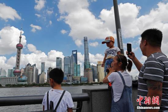 资料图:游客在蓝天下的外滩滨江步道合影留念。 殷立勤 摄