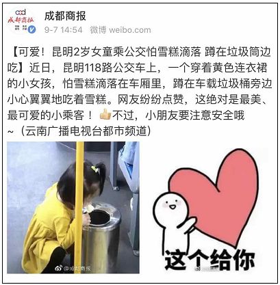 就这样,小女孩蹲在垃圾筒边,一口一口地将雪糕吃完。这时,坐在女孩旁边的一名乘客还拿出了一张纸来,给那个女孩擦拭嘴边的雪糕。