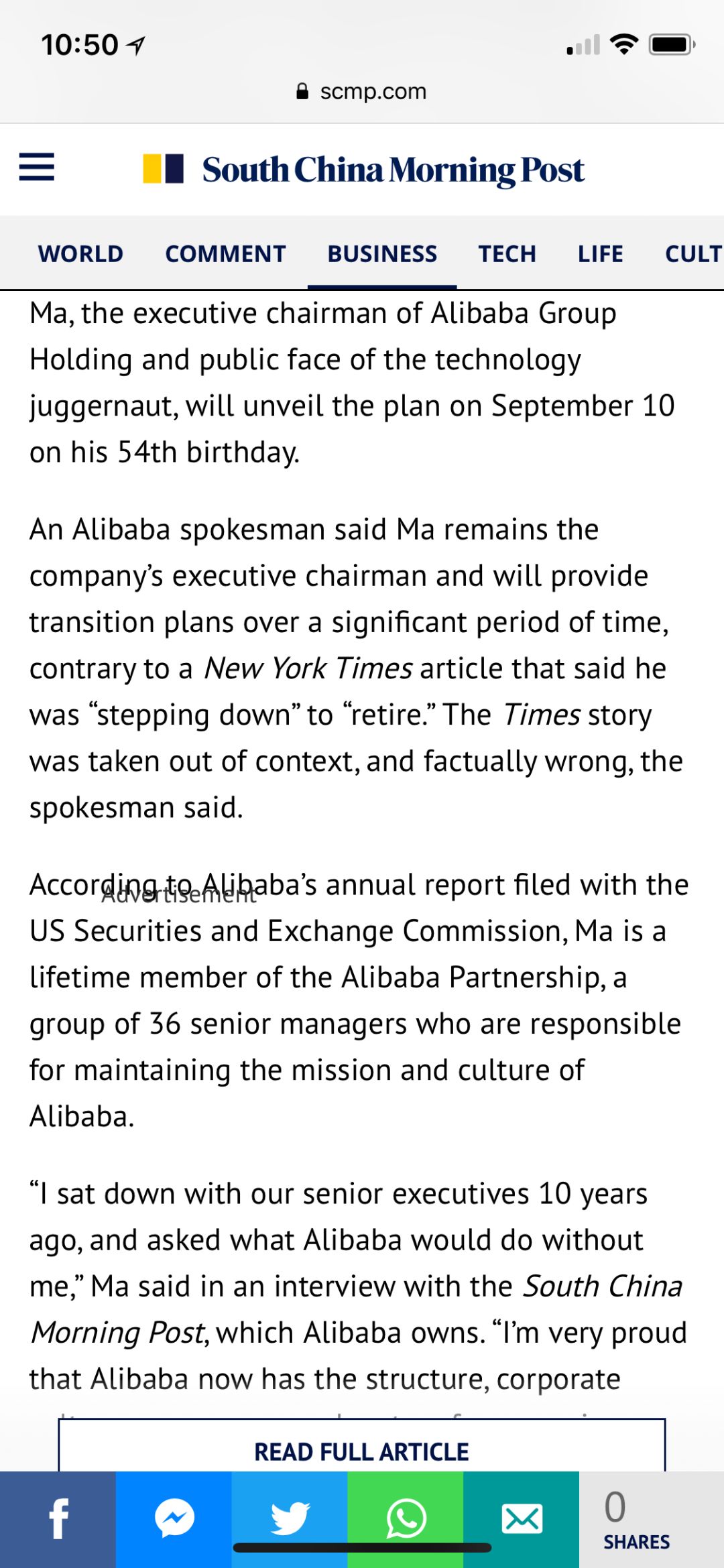 当记者向阿里巴巴求证“退休”一事时,阿里巴巴方面回应称,《南华早报》的消息没有问题,但目前没有更多消息可以披露。