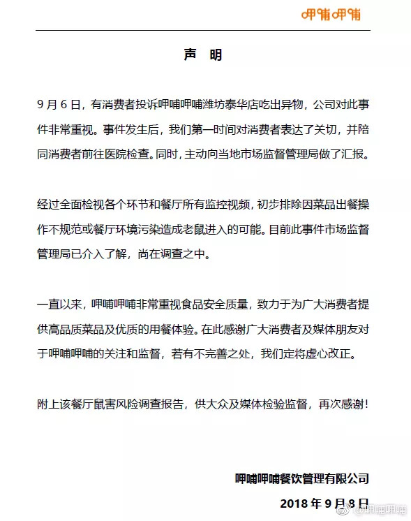 呷哺呷哺还在官方微博上公布了一份对呷哺呷哺潍坊泰华城店的鼠害风险调查报告,称9月6日晚食客称在该店火锅内捞出老鼠后,9月7日晚,负责门店鼠害防治的公司对店内防鼠结构建筑结构和外鼠害入侵条件进行调查分析,未发现老鼠活动迹象。