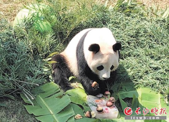 大熊猫“成双”正在狂吃它的生日蛋糕。长沙晚报记者 周柏平 通讯员 刘姝伶 摄影报道