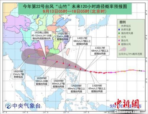 海南省气象台监测,第22号台风“山竹”(超强台风级)13日05时中心位于北纬14.4度、东经132.0度,也就是在距离菲律宾马尼拉偏东方向约1190公里的西北太平洋洋面上,其将以每小时20~25公里的速度向西偏北方向移动,强度变化不大,15日凌晨到上午登陆或擦过菲律宾吕宋岛东北部,15日中午前后移入南海东北部海面,然后趋向广东西部和海南东部沿海。