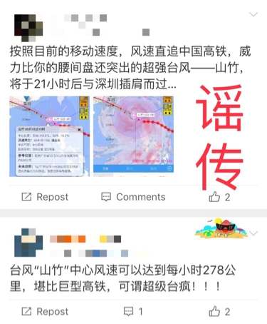 【谣传】有网民发消息称,“山竹”中心风速高达每小时278公里,速度堪比中国高铁。