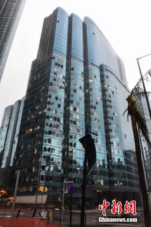 香港红磡海滨广场二期,数十只玻璃窗被强风损毁。中新社记者 麦尚旻 摄