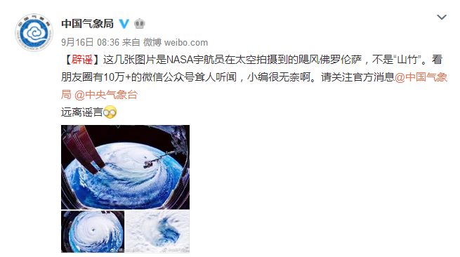 实际上,这是NASA宇航员9月12日在太空拍摄到的飓风“佛罗伦斯”,而不是“山竹”。
