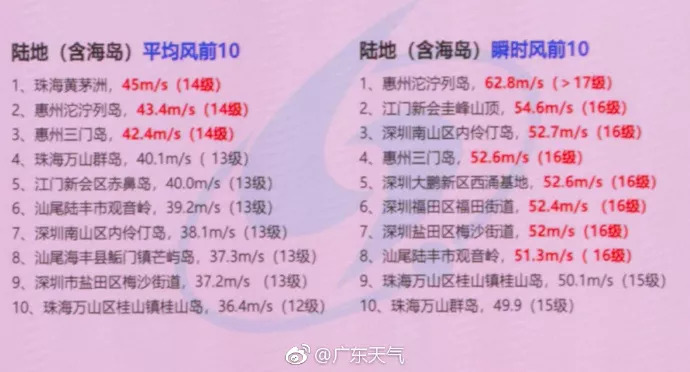 阳江东部、肇庆东南部、江门、佛山、广州中南部、中山、珠海、香港、澳门、深圳、东莞、惠州南部、汕尾西部有11~13级,珠海、深圳、香港、澳门等局地14~16级,惠州的沱泞列岛、香港最大达17级。