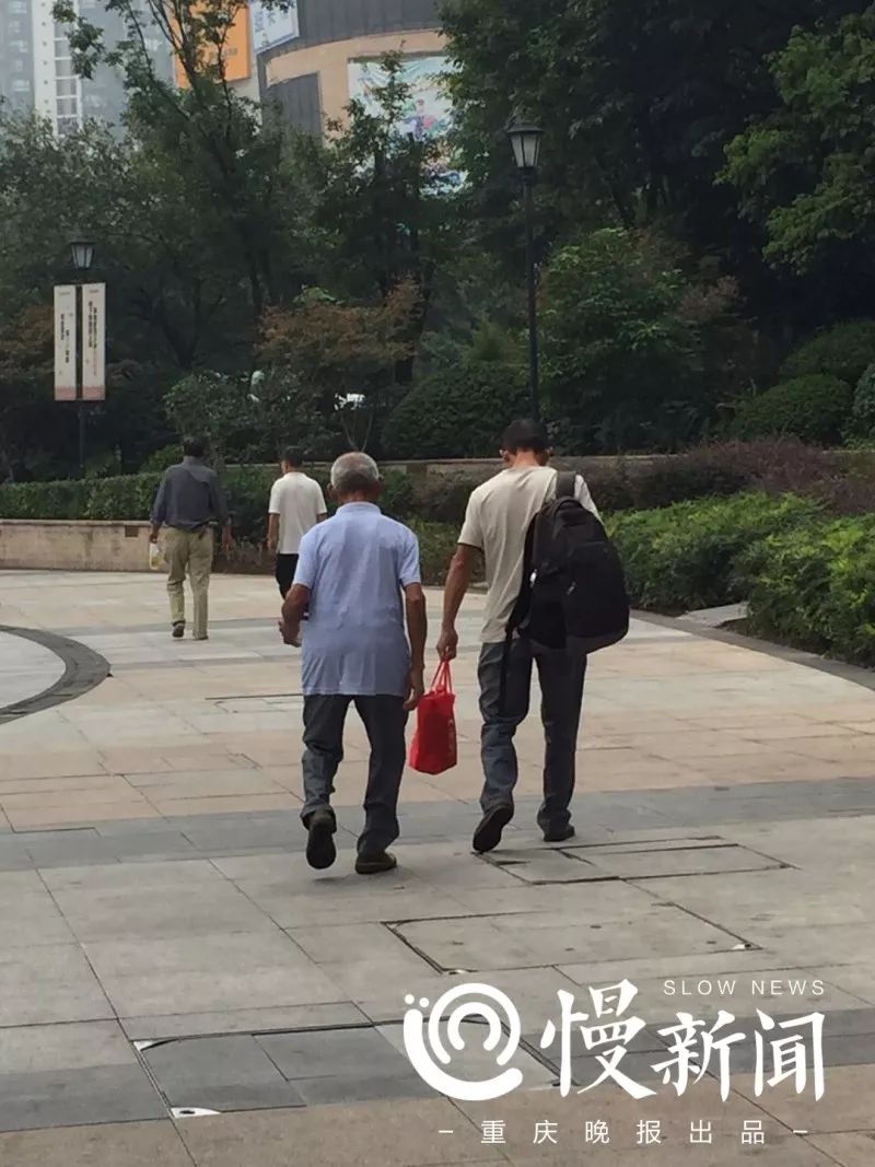 一个皮肤黝黑身材清瘦的中年男子,背着一个大双肩包,手里还提着一个布包。旁边站着一个头发花白的老人,身材瘦小,背有些佝偻。老人双手没拿东西,一只手抓着旁边中年男子的手臂。这位老人就是来重庆寻亲的主人公,名叫易兴悟,今年78岁,旁边的中年男子就是他儿子,名叫易光成,今年43岁。
