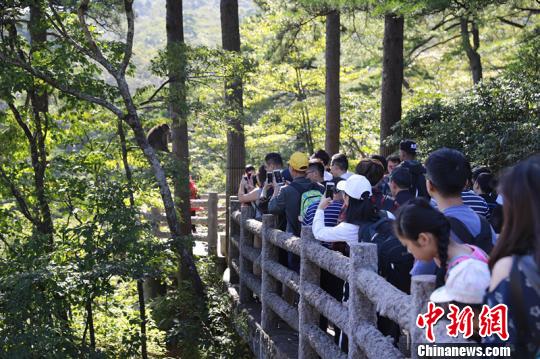 中秋小长假期间,游客在安徽黄山抓拍短尾猴。 张涛 摄