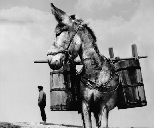 为了拍到“积极向上”的照片,谢万清习惯将自己的身子放低。拍《征服》时,他蹲在地上,让画面里的人“把牛抽得再跑快一点儿”。他从低处拍挑水的毛驴,把驴脑袋拍得硕大,木桶比远处站着的人还高。上世纪90年代,有手艺人扎了一堆红灯笼,垒在自行车后座上去县城集市上卖,他趴在马路中间,按完快门就往路边一滚。