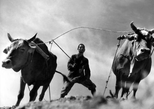 两幅作品的其中一幅摄于1986年,画面上一位农民挽起裤腿扎着弓步,用力扯着前面的两头耕牛,这幅作品名为《征服》。另外一幅叫《朴实的爱》,两位头发花白的老人蹲坐在麦地里,戴着瓜皮帽的老汉一手托着烟袋锅,一手探出去给妻子擦汗。他的大多数早期作品都是黑白的,“耐看”。
