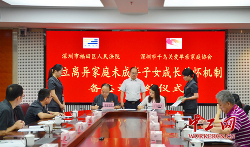 中工网讯(记者刘友婷 通讯员周丹)9月27日,深圳市福田区人民法院与深圳市千鸟关爱单亲家庭协会(以下简称“千鸟协会”)签署《关于建立离异家庭未成年子女成长关怀机制的备忘录》,创新家事审判中未成年人权益保护方式方法,更好地帮助离异家庭未成年子女适应生活、融入社会、健康成长。这也标志着福田法院“司法引领+社会参与”这一特色化的新型家事纠纷综合协调解决机制的专业水准再上新台阶,为家事审判改革和家事纠纷多元化解提供更强有力的支撑。福田区委政法委专职副书记曾崇富,福田法院党组成员、副院长黄汉胜,深圳市千鸟关爱单亲家庭协会会长孙亚华出席备忘录签署仪式。