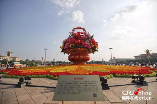 图为9月30日,北京天安门广场上的中心花坛亮相。摄影:沈湜