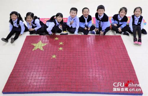 图为沈阳某幼儿园内,老师带着小朋友们用魔方拼出了一面五星红旗。摄影:李子平